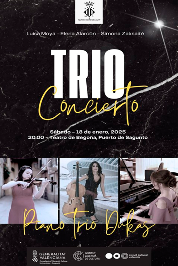 Luisa Moya, al violín; Elena Alarcón, al violoncelo; y Simona Zaksaité, al piano, son las tres componentes de este trío que presentará un programa musical cuya primera parte arrancará con Piano Trio n.5 en Re M op.70 n.1. de Beethoven, que consta de un allegro vivace con brio, un largo assai et espressivo y un presto.