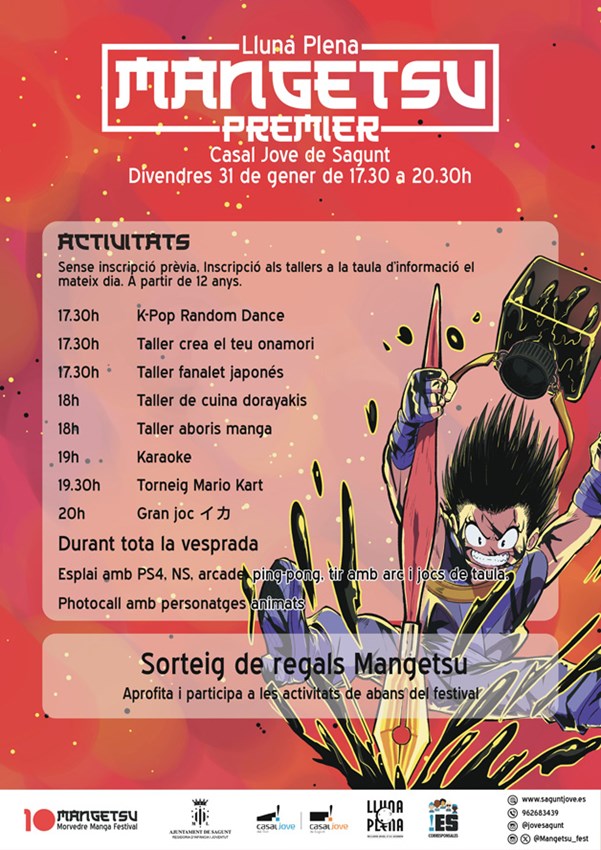 Bajo la nomenclatura Lluna Plena: Mangetsu Premier, desde el departamento se anima a las personas aficionadas a las culturas asiáticas a disfrutar con carácter previo de las actividades previstas relacionadas en el festival en el Casal Jove de Sagunto (calle Romeu, 8).