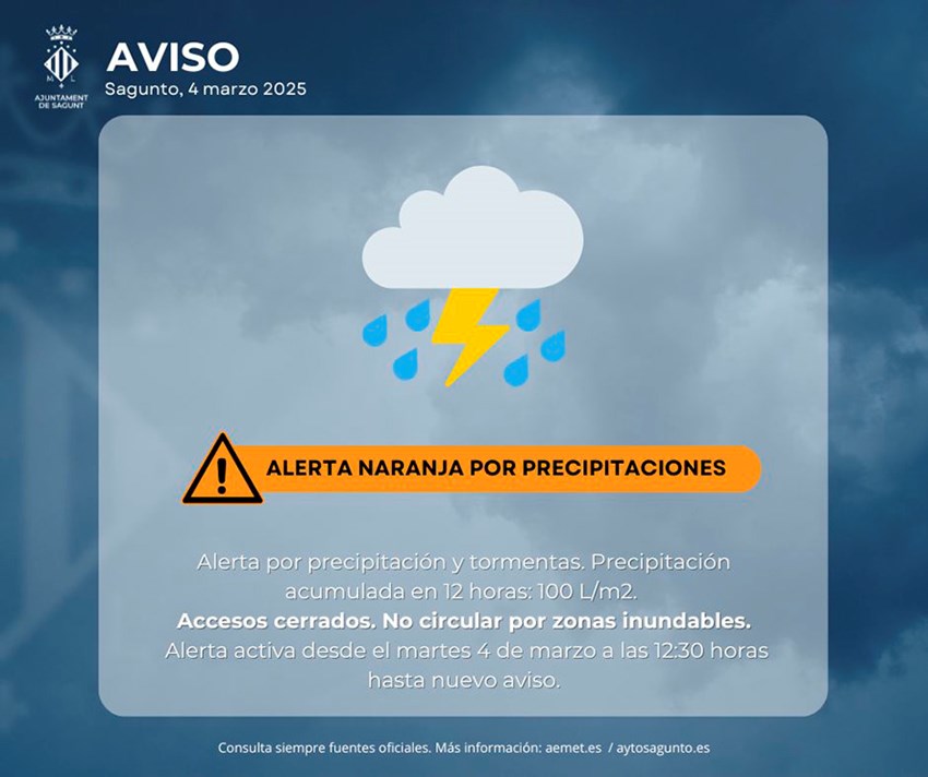 Desde el Ayuntamiento de Sagunto se recuerda a la ciudadanía algunas de las recomendaciones que, por una mayor seguridad, cabe seguir en estas situaciones de alerta por precipitaciones intensas, como son extremar las precauciones e informarse en tiempo real de los avisos oficiales del Ayuntamiento de Sagunto, AEMET y el 112 CV.
