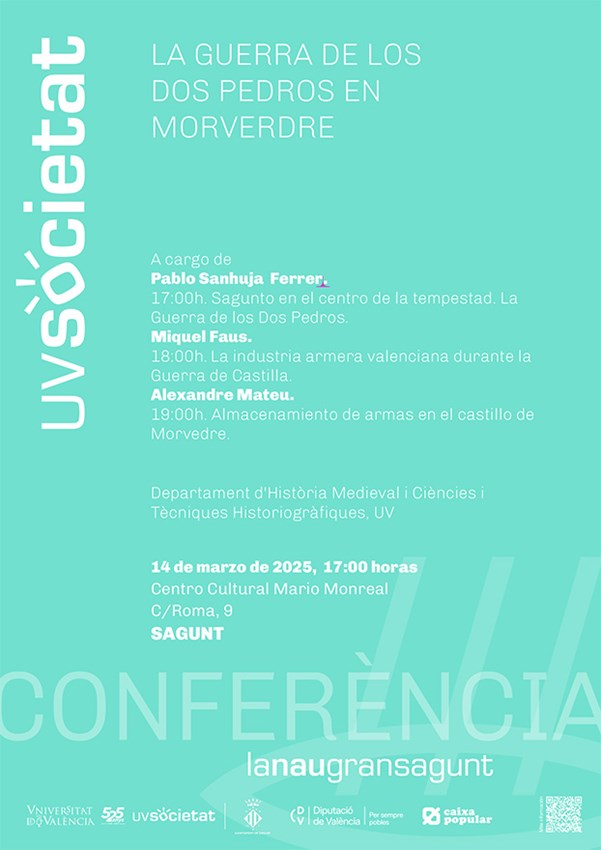 La jornada de divulgación sobre la Guerra de los Dos Pedros comenzará a las 17 horas con la conferencia del doctor Pablo Sanahuja titulada Sagunto en el centro de la tempestad. La Guerra de los Dos Pedros. A continuación, Miquel Faus profundizará sobre La industria armera valenciana durante la Guerra de Castilla (18 horas) y Alejandro Mateu pondrá el colofón al evento con una ponencia sobre el Almacenamiento de armas en el castillo de Morvedre (19 horas).