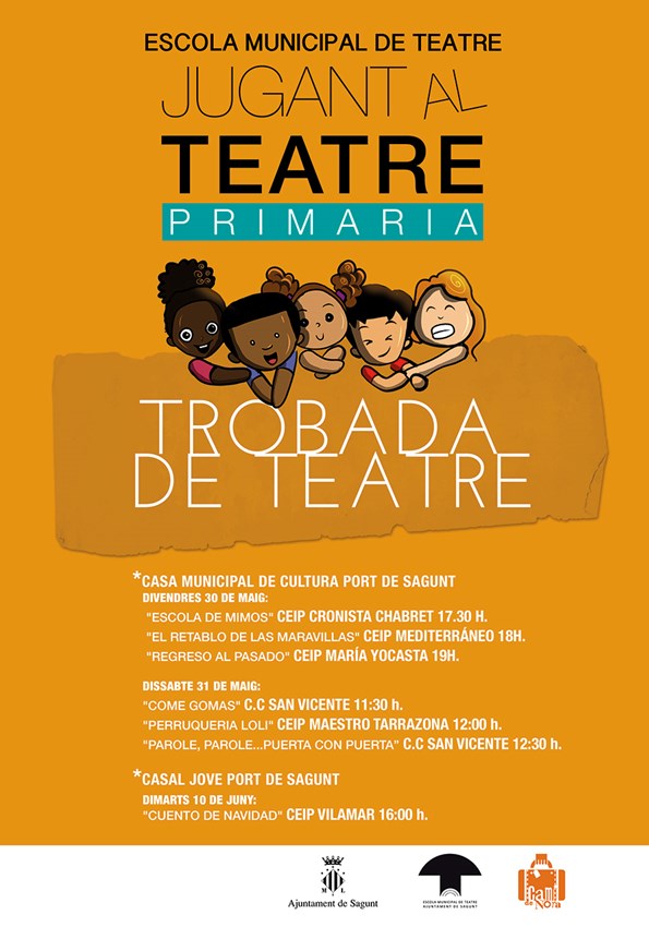 Hoy mismo comienza la ‘Mostra de Teatre’ con la representación en la Casa Municipal de Cultura de Puerto de Sagunto de Escola de Mimos (17:30 horas), a cargo de los y las estudiantes de Primaria del CEIP Cronista Chabret. A continuación (18 horas), los alumnos y las alumnas del CEIP Mediterráneo escenificarán El retablo de las maravillas y el alumnado del CEIP María Yocasta interpretará la obra Regreso al pasado (19 horas).