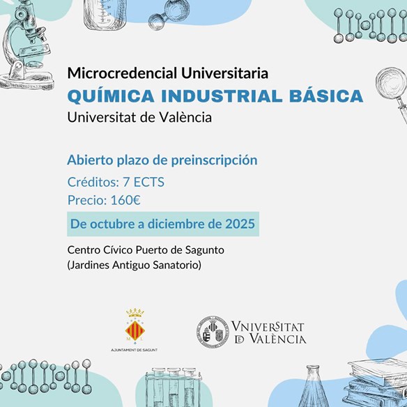 El Ayuntamiento de Sagunto y la Universidad de Valencia abren el plazo de inscripción para participar en la ‘Microcredencial Universitaria en Química Industrial Básica’, un programa de formación para personas de entre 25 y 64 años con el que se busca mejorar las condiciones de inserción laboral de la población.