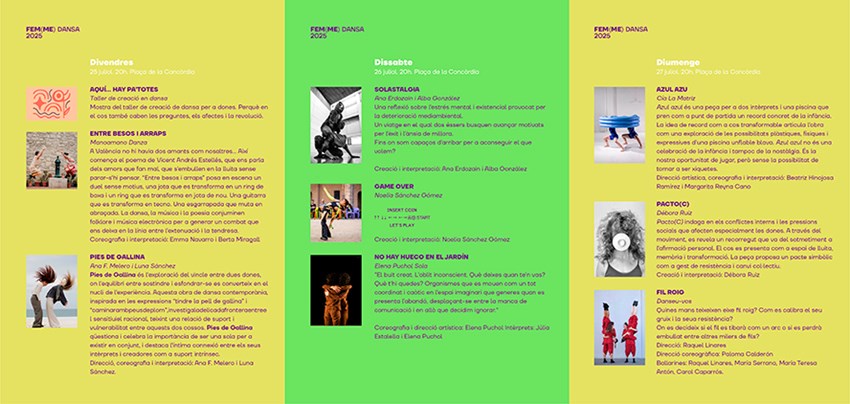 El festival nació en 2018 con el objetivo de acercar a la ciudadanía la danza creada e interpretada por mujeres, así como para reivindicar su espacio artístico. De este modo, Fem(me) Dansa ofrece año tras año una programación de calidad en un entorno abierto, accesible y para todos los públicos.