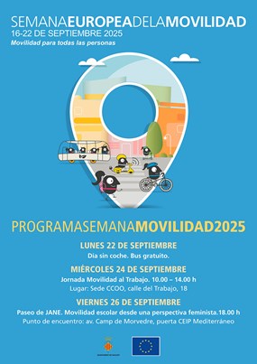 La programación de esta edición comenzará el lunes 22 con el Día sin coche, en el que el autobús urbano será gratuito. El miércoles 24 se celebrará en la sede de CCOO Camp de Morvedre-Alt Palància (calle del Trabajo, 18, Puerto de Sagunto) la Jornada Comarcal de Movilidad Sostenible al Trabajo.