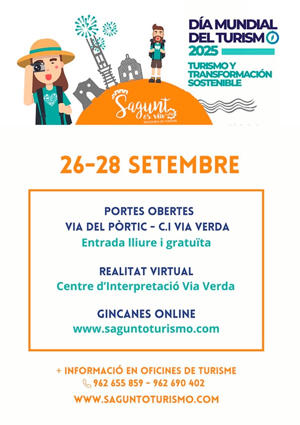 La concejala delegada de Turismo, Natalia Antonino, ha invitado a la ciudadanía a descubrir Sagunto a través de esta iniciativa: “Este año celebramos el Día Mundial del Turismo en términos de sostenibilidad con yincanas digitales para descubrir el pasado histórico del municipio. También se llevarán a cabo jornadas de puertas abiertas en la Via del Pòrtic y el Centro de Interpretación Vía Verde Ojos Negros, espacios en los que se podrá disfrutar de una experiencia de realidad virtual”.