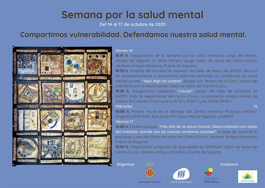 Un año más, la Concejalía de Servicios Sociales del Ayuntamiento de Sagunto se suma al movimiento que reivindica una mayor y mejor atención al bienestar psicológico y social. Por ello, se ha organizado una programación para los días 14, 15 y 17 de octubre bajo el lema ‘Compartimos vulnerabilidad, defendamos nuestra salud mental’. Estas acciones se hacen con motivo del Día Mundial de la Salud Mental, que se celebra el 10 de octubre.
