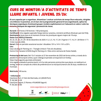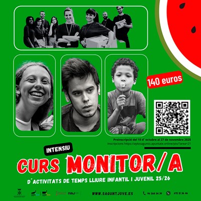 La Concejalía de Juventud e Infancia del Ayuntamiento de Sagunto imparte un año más el curso intensivo para formar a monitores de tiempo libre infantil y juvenil. La inscripción a esta formación se realizará en línea y el plazo comienza hoy, miércoles 15 de octubre, y finaliza el jueves 27 de noviembre.