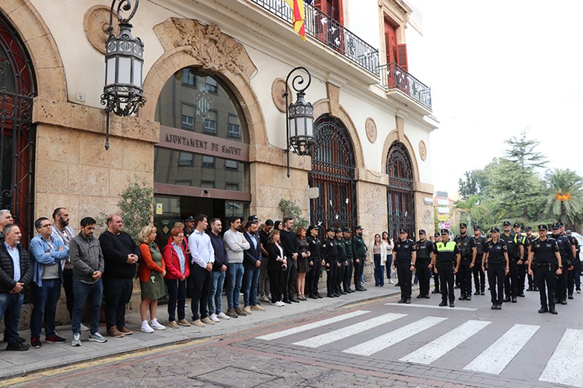 El Ayuntamiento de Sagunto, los cuerpos y fuerzas de seguridad del municipio y un importante número de ciudadanos y ciudadanas se han concentrado en el mediodía de este miércoles a las puertas del Consistorio para guardar cinco minutos de silencio en memoria de las víctimas de la DANA, coincidiendo con el primer aniversario de la catástrofe, y también como homenaje a las personas y entidades que ayudaron a los pueblos afectados y a sus vecinos y vecinas.