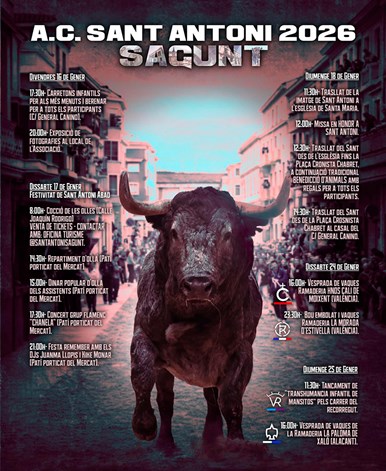 La Asociación Cultural Sant Antoni ha presentado en el Ayuntamiento de Sagunto, junto con la Concejalía de Fiestas y Cultura Popular, la programación de las fiestas de Sant Antoni 2026. Se trata de una propuesta que combina actos infantiles, actividades culturales, tradición religiosa y festejos taurinos a lo largo de varios fines de semana en su 26º aniversario.
