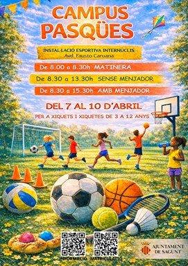 El Ayuntamiento de Sagunto favorecerá la conciliación familiar durante el 7, 8, 9 y 10 de abril con el Campus Pasqües, la Escola Pascua y el DiverPascua. Estos tres programas están organizados por las concejalías de Actividad Física, Salud y Deportes, de Juventud e Infancia y de Servicios Sociales, respectivamente.