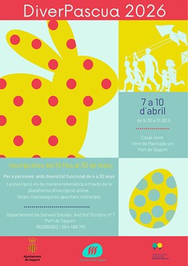 DiverPascua ofrece un programa de actividades de ocio y tiempo libre para personas con diversidad funcional de edades comprendidas entre los 4 y 30 años que estén empadronadas en el municipio. La sede estará ubicada en el Casal Jove Puerto de Sagunto, espacio en el que también se desarrollará la Escola de Pascua para fomentar la inclusión compartiendo actividades artísticas y lúdicas.