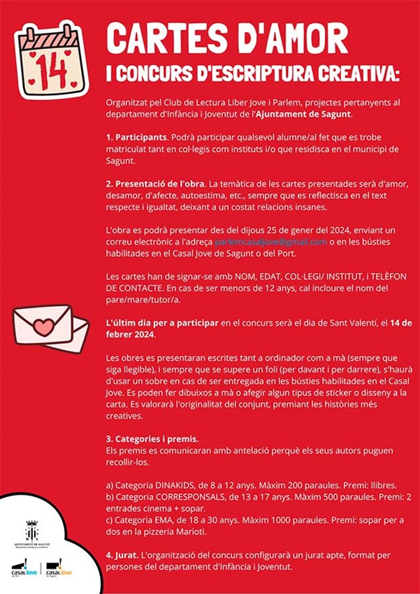 El Club de Lectura Liber Jove y Parlem, del departamento de Juventud e Infancia, han organizado con motivo de San Valentín un concurso de escritura creativa de cartas de amor dirigido al alumnado matriculado en colegios e institutos y/o que resida en Sagunto y se podrá participar hasta el 14 de febrero.