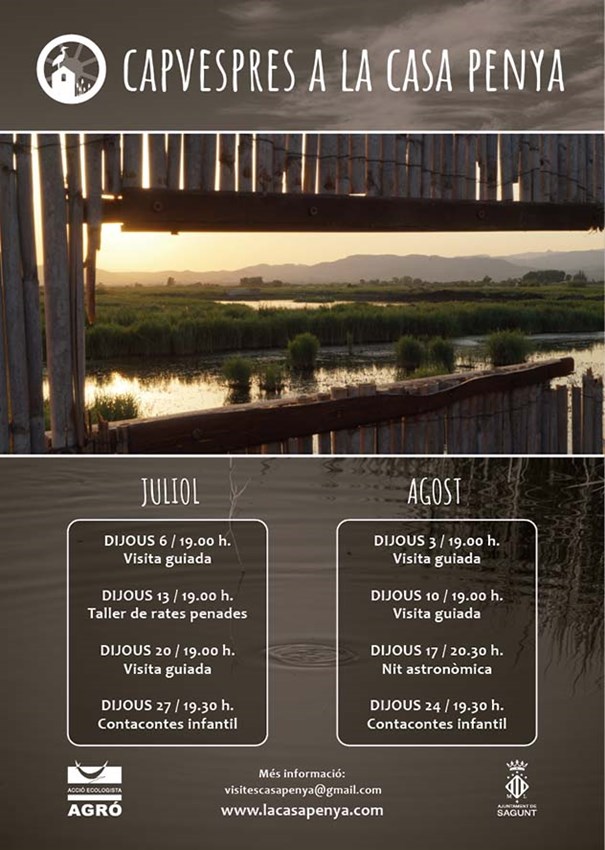 Los jueves de julio y agosto se celebrarán en el centro de educación medioambiental de la marjal de Almardà-Almenara ocho actividades especiales con motivo de la campaña de “Capvespres en La Casa Penya”. Las actividades consistirán en cuatro visitas guiadas, dos cuentacuentos infantiles, un taller sobre murciélagos y una noche astronómica. Con estas actividades, organizadas por Acción Ecologista-Agró y el Ayuntamiento de Sagunto, se pretende compartir con todas y todos un verano de naturaleza, marjal y puestas de sol. Igualmente, se informa que el centro permanecerá cerrado los domingos este verano.