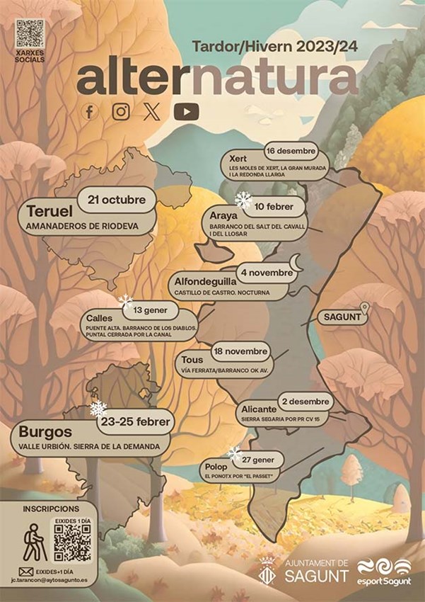 El programa municipal de ocio alternativo en la naturaleza Alternatura, organizado por la Concejalía de Actividad Física, Salud y Deportes del Ayuntamiento de Sagunto, realizará durante la temporada otoño-invierno 2023/2024 nueve excursiones por la Comunidad Valenciana, Teruel y Burgos-La Rioja.