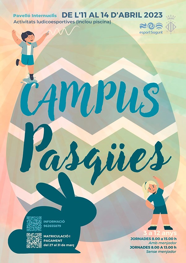 Las concejalías de Actividad Física, Salud y Deportes, Juventud e Infancia y Servicios Sociales del Ayuntamiento de Sagunto han presentado el Campus Pasqües, el Esplai Pasqua y Diver Pasqua del ejercicio 2023, respectivamente. Las tres iniciativas están previstas para los días 11, 12, 13 y 14 de abril. Los destinatarios del Campus Pasqües son niños y niñas de entre 3 y 12 años. El Esplai Pasqua es para los y las matriculados en centros de infantil y primaria nacidos del 2019 al 2011, ambos incluidos. Por otro lado, el Diver Pasqua está destinado a personas con diversidad funcional  intelectual empadronadas en el municipio, que estén escolarizadas en los centros de Educación Especial, o de mayores que no estén escolarizados, con edades comprendidas entre los 4 y los 30 años. La finalidad, además de ofrecer actividades formativas y lúdicas que ocupen el tiempo libre durante las vacaciones de Pascua, es facilitar la conciliación laboral de las familias.