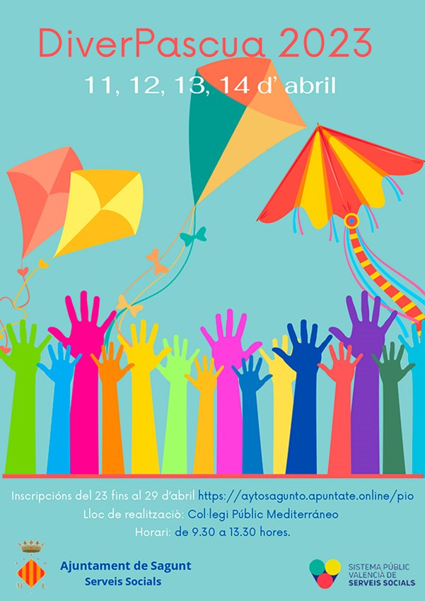Por último, Diver Pasqua tendrá lugar en el CEIP Mediterráneo de Puerto de Sagunto, de 9.30 a 13.30 horas y habilitará un total de 15 plazas. El concejal de Servicios Sociales, Alejandro Sotoca, ha anunciado las actividades que se realizarán en ese campus: «Dentro de las actividades que se pueden realizar en este campus hay actividades artísticas, psicomotrices, de expresión corporal, musicoterapia, canciones de Pascua, relajación, talleres de sombras y el taller dulce de Pascua». Para la inscripción, los interesados e interesadas deberán acceder al siguiente enlace: https://aytosagunto.apuntate.online/pio/. Además, podrán informarse en el Departamento de Servicios Sociales en la avenida 9 de Octubre nº 7 en Puerto de Sagunto, o bien contactando con los teléfonos 962685882 o 664468791.