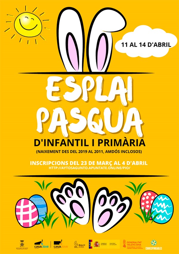 El Esplai Pasqua, que habilitará 120 plazas, se desarrollará en los Casales Jove de Sagunto y Puerto de Sagunto, de 9.00 a 13.30 horas, así como en el CEIP Mediterráneo. El plazo de inscripciones estará abierto desde el jueves 23 de marzo hasta el martes 4 de abril. La inscripción será de forma telemática a través de la plataforma de inscripción online: https://aytosagunto.apuntate.online/pio/. El coste de la matriculación en el Esplai Pasqua es de 32 euros. Los matriculados disfrutarán de juegos, talleres y actividades culturales. «La temática será la Pascua. Habrá talleres de cometas, de huevos de pascua, juegos tradicionales, gincanas, etcétera», tal y como ha indicado el concejal de Juventud e Infancia, Guillermo Sampedro.