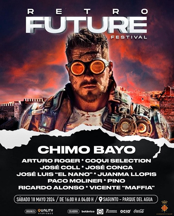 El Retrofuture Festival es un evento musical programado para el 18 de mayo en el que el famoso dj valenciano Chimo Bayo es el cabeza de un cartel compuesto por disyoqueis locales y nacionales. El Ayuntamiento de Sagunto es una de las entidades colaboradoras en este festival remember organizado por la empresa Quality Xperiencie.