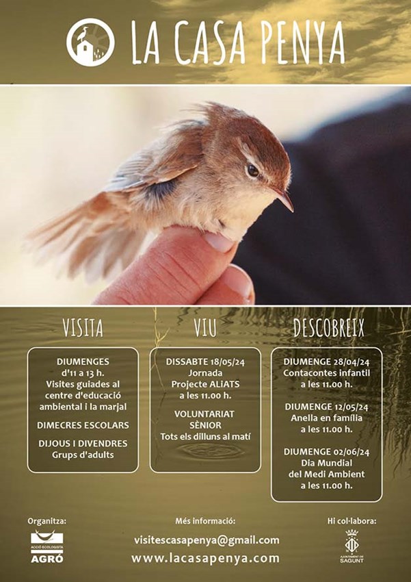 La primera será un cuentacuentos infantil el domingo 28 de abril. El domingo 12 de mayo se realizará un anillamiento en familia. Y el domingo 2 de junio se celebrará el Día del Medio Ambiente. Además, el sábado 18 de mayo se presentarán los resultados del proyecto Aliats. Esta es una iniciativa de educación ambiental para concienciar sobre la importancia de la fauna urbana insectívora, que da continuidad a la campaña ‘Más golondrinas, menos mosquitos’ impulsada, diseñada y creada por Acción Ecologista-Garceta con la colaboración de los departamentos de Medio Ambiente, Educación y Juventud del Ayuntamiento de Sagunto y que ha contado con el apoyo de Arcelor-Mittal.