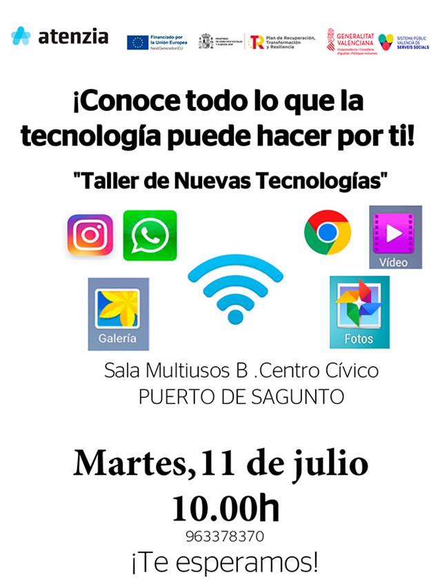 El martes 11 de julio, en el Centro Cívico de Puerto de Sagunto a las 10 horas, se impartirá el curso “Conoce lo que la tecnología puede hacer por ti”. Está organizado por Atenzia y cuenta con la colaboración del Área del Mayor del departamento de Servicios Sociales del Ayuntamiento de Sagunto. Es un curso enfocado a las personas mayores del municipio.