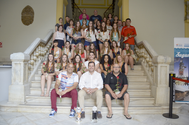 El alcalde en funciones del Ayuntamiento de Sagunto, Sergio Muniesa, y la delegada de Deportes en funciones, Tania Ortiz, recibieron ayer en el Salón de Plenos del Ayuntamiento de Sagunto al equipo cadete del BM Morvedre tras lograr la medalla de bronce en el Campeonato de España de Balonmano de la categoría femenina cadete que se disputó la semana pasada en nuestra localidad. También aprovecharon la recepción para dar la enhorabuena al club por los buenos resultados del equipo de División de Honor Plata, las juveniles e infantiles.