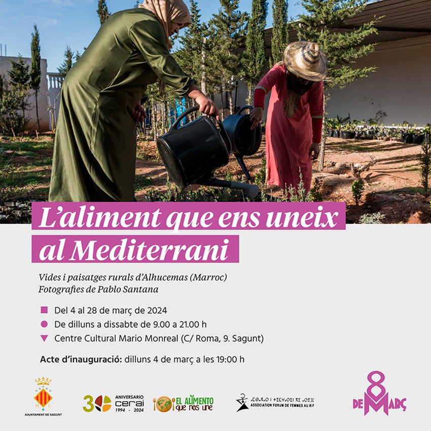 La exposición fotográfica El alimento que nos une se inaugura esta tarde, 4 de marzo, a las 19 horas en el Centro Cultural Mario Monreal (C/ Roma, 9, Sagunto) y busca visibilizar el papel de las mujeres rurales en la sostenibilidad socioecológica de las comunidades del Rif, así como reflexionar sobre los desafíos que enfrentan debido a la erosión, la escasez de lluvia, el éxodo rural y la migración.