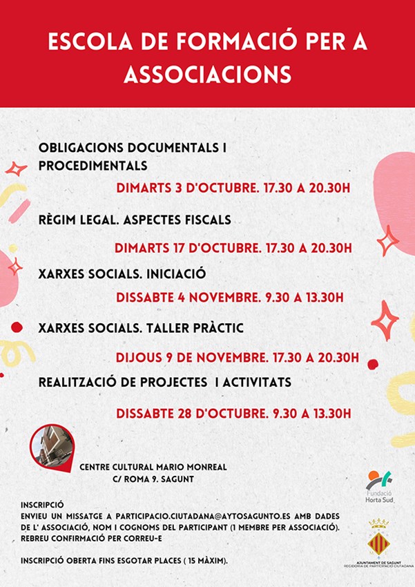 En definitiva, unas jornadas que brindan una oportunidad al tejido asociativo de la ciudad, dotándolo de mayores recursos para el funcionamiento interno y externo de las mismas. Para poder participar en los mismos se deberá enviar un correo electrónico a participacionciudadana@aytosagunto.es con los datos de la asociación, nombre y apellidos del participante (que deberá ser un miembro de la asociación). Se confirmará con ese mismo correo y quedará la inscripción abierta hasta agotar las 15 plazas de cada uno de ellos.