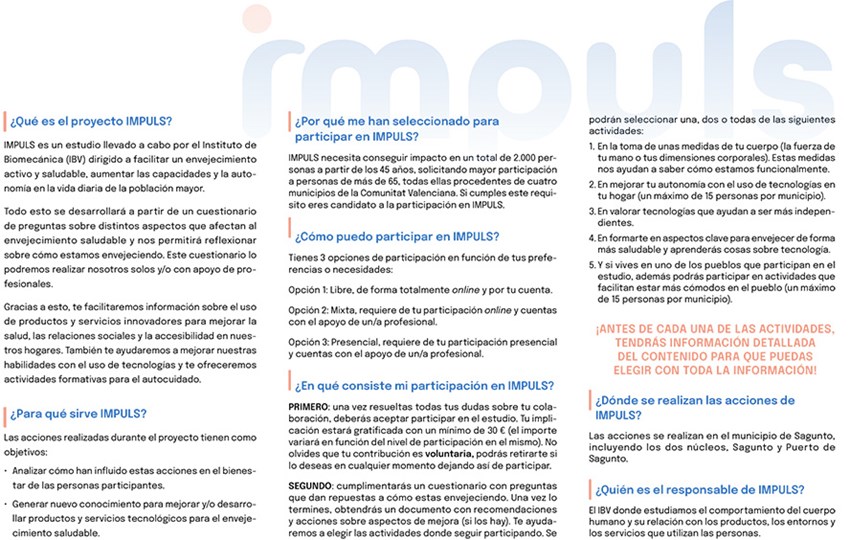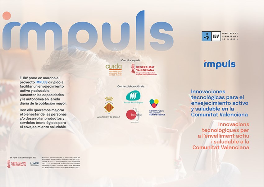 IMPULS es un proyecto de I+D+i que está desarrollando el Instituto de Biomecánica de Valencia (IBV) en varias localidades de la Comunidad Valenciana, entre las que se encuentra el municipio de Sagunto. El departamento de Servicios Sociales del Ayuntamiento de Sagunto colabora en esta investigación que busca impulsar innovaciones tecnológicas para el envejecimiento activo y saludable. IMPULS está cofinanciado por el Instituto Valenciano de Competitividad Empresarial (IVACE) y apoyado por la Conselleria de Igualdad y Políticas Inclusivas de la Generalitat Valenciana, así como por la Asociación para el Cuidado de la Calidad de Vida (CVIDA).