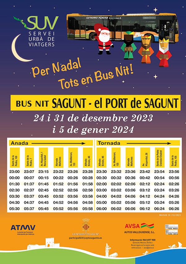 El Ayuntamiento de Sagunto, desde la concejalía de Movilidad Urbana, pone en marcha la campaña ‘Per Nadal, Tots en Bus Nit!’, que amplía el servicio de autobús nocturno durante las próximas fiestas navideñas. Al servicio habitual de los sábados, se le unirá el de las noches de los domingos 24 y 31 de diciembre, es decir, Nochebuena y Nochevieja, así como el del viernes 5 de enero, en la noche previa al Día de Reyes.
