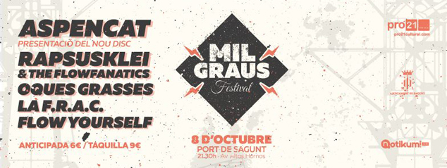 El Ayuntamiento de Sagunto organiza “Mil Graus Festival”, un festival que se celebrará, el próximo 8 de octubre, a los pies del Horno Alto (Avenida Altos Hornos, Puerto de Sagunto). En el cartel del festival destaca la actuación de Aspencat que presentará su nuevo disco; y Rapsusklei, uno de los artistas más reconocidos de la escena del hip-hop estatal. Les acompañarán Oques Grasses y la F.R.A.C, además, cierra el cartel el grupo local Flow Yourself.