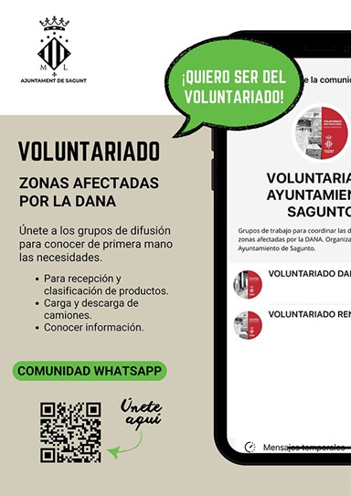 El Ayuntamiento de Sagunto ha habilitado una comunidad de WhatsApp para coordinar las necesidades de personal voluntario y trasladar a la ciudadanía las peticiones de los municipios afectados. A través de esta comunidad, el consistorio comunicará la necesidad de personal y las tareas a desarrollar para que aquellas personas que lo deseen puedan participar.