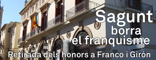 El Ayuntamiento de Sagunto retirará de forma inmediata los títulos honoríficos concedidos a José Antonio Girón de Velasco, ministro durante la dictadura franquista, y a Francisco Franco Bahamonde, jefe del estado desde 1939 a 1975. Además, se modificarán los nombres de las calles Vascongadas, Castilla La Nueva, Castilla La Vieja y León por los nombres actuales correspondientes a las Comunidades Autónomas nacidas de la democracia, según se recoge en sus estatutos de autonomía. Este asunto ya está en marcha en la Comisión de Toponimia de la ciudad.