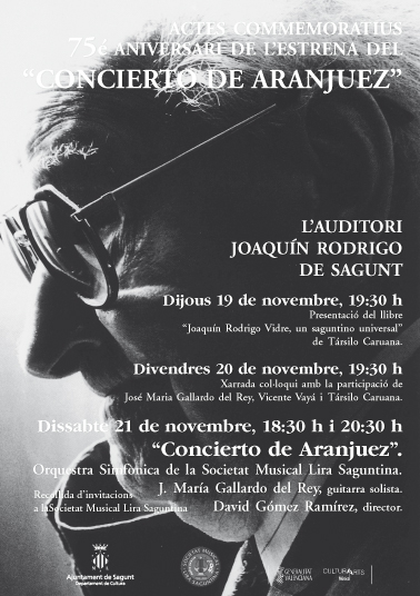 Finalmente, el sábado 21 de noviembre, el Ayuntamiento de Sagunto en colaboración con la Orquesta Sinfónica Lira Saguntina rendirán homenaje al maestro Rodrigo con un concierto que tendrá una sesión a las 18:30 horas y otra a las 20:30 horas. A esta última representación asistirán, entre otras autoridades, el alcalde de Sagunto, Francesc Fernàndez y la alcaldesa de la ciudad de Aranjuez, Cristina Moreno, con la que previamente se firmará el protocolo de amistad entre ambas ciudades, el cual fue aprobado en el último pleno con la finalidad de plasmar los acuerdos, convenios y proyectos a desarrollar conjuntamente, los cuales están motivados por la relación existente entre las dos ciudades fruto del legado que dejó el maestro Rodrigo.