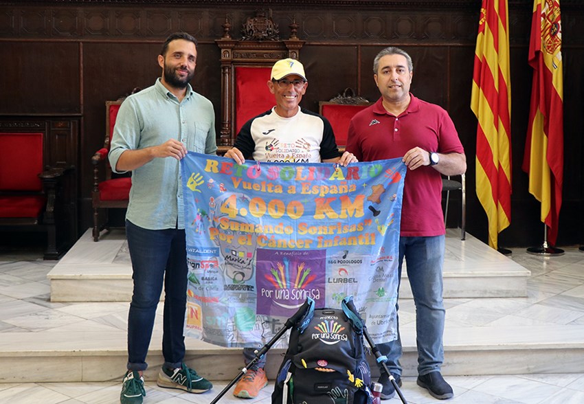 El alcalde de Sagunto, Darío Moreno, y el concejal de Actividad Física, Salud y Deportes, Javier Timón, han recibido hoy a José Antonio Nieto, un caminante que está realizando la vuelta a España en beneficio de la asociación Por Una Sonrisa, dedicada a la lucha contra el cáncer infantil.