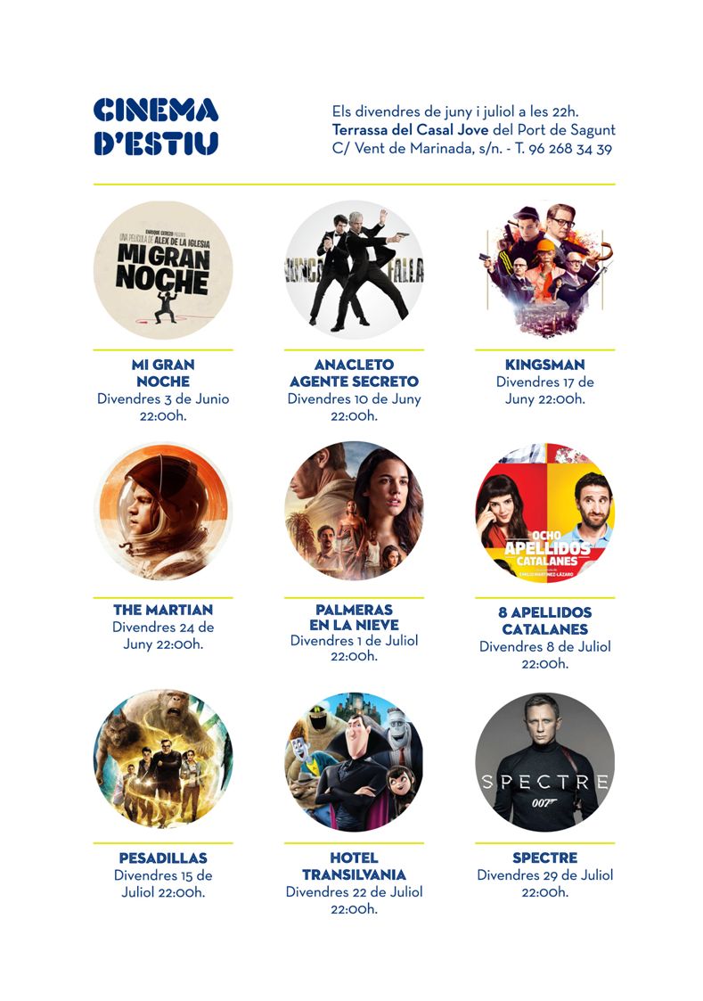 La programación comienza este viernes, 3 de junio, con la película de Alex de la Iglesia “Mi gran noche”, siempre a partir de las 22 horas, y continúa el viernes, 10 de junio, con la proyección de “Anacleto, agente secreto”, un filme de Javier Ruiz Caldera basado en las historias creadas por Vázquez. El viernes, 17 de junio, se proyectará la película inglesa de espionaje “Kingsman, servicio secreto”, mientras que el viernes, 24 de junio, se emitirá “The Martian”, una producción de Ridley Scott ganadora del Globo de Oro a mejor película el pasado año.