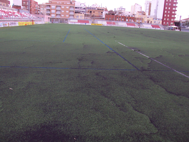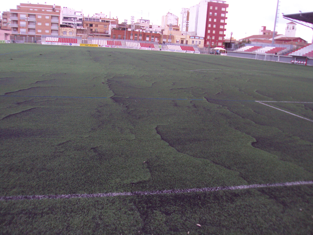 La instalación del césped artificial del campo del Fornás ha cumplido diez años. Según se expone en el informe, se instaló un césped de dudosa calidad, una mala instalación y un drenaje insuficiente. Actualmente ninguna parte del terreno supera los 2 cm. de relleno, y en algunos casos menos de 1 cm., por lo que se puede considerar que el campo no es apto para la práctica deportiva intensiva. En el estado en el que se encuentra no superaría la absorción del choque que garantice la seguridad del jugador y podría provocar lesiones.