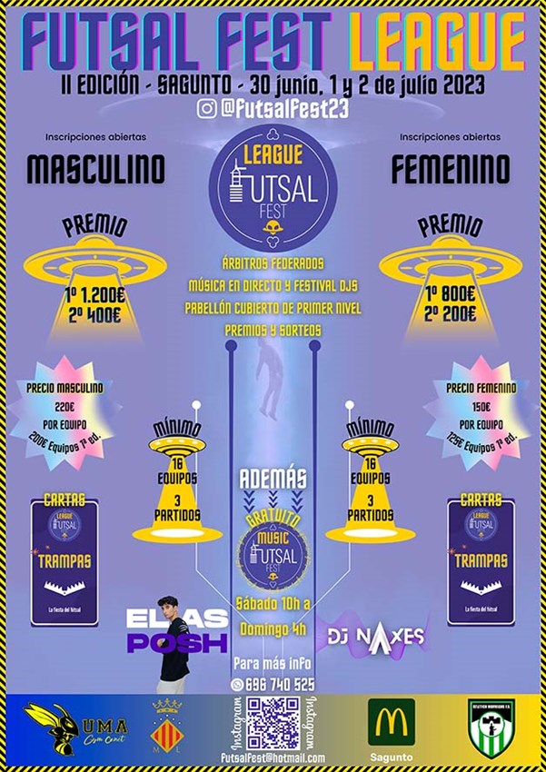 La segunda edición del Futsal Fest League se desarrollará en el pabellón del Polideportivo Municipal (internúcleos) entre el 30 de junio y el 2 de julio. Este evento fusiona la música y el deporte, en este caso, el fútbol sala. El Futsal Fest League consta de un torneo masculino y otro femenino, en los que los y las participantes juegan con música en directo. El Ayuntamiento de Sagunto es colaborador en este evento deportivo.