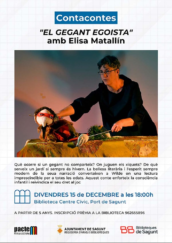 El departamento de Archivo y Bibliotecas ofrece este viernes, 15 de diciembre, a las 18 horas, el cuentacuentos El gegant egoista, dirigido a niños y niñas a partir de cinco años que fortalece la conciencia infantil y reivindica el derecho al juego. Esta actividad llega de la mano de Elisa Matallín a la Biblioteca del Centro Cívico de Puerto de Sagunto.