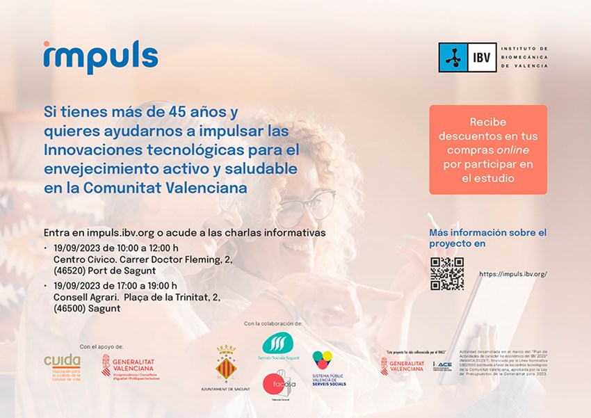 Las personas que participen ayudarán a impulsar acciones de innovación tecnológica para el envejecimiento activo y saludable de los mayores de nuestro municipio, dentro del proyecto de investigación IMPULS realizado por el Instituto de Biomecánica de Valencia cuyos objetivos son desarrollar soluciones novedosas aportadas por la tecnología para el cuidado de personas mayores y analizar el impacto de estas acciones en su bienestar y calidad de vida.