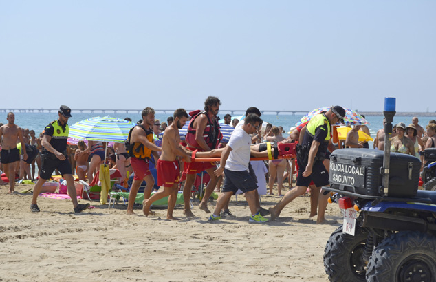 El servicio de salvamento y socorrismo del Ayuntamiento de Sagunto, en colaboración con agentes de la Policía Local, ha realizado hoy a las 12 horas un simulacro de emergencia de rescate acuático en el espigón norte de la playa de Puerto de Sagunto. El objetivo del simulacro ha sido comprobar la eficacia de los distintos cuerpos de seguridad y sanitarios a la hora de coordinarse en una actuación de este tipo. En el simulacro han participado cinco policías locales y seis miembros del equipo de salvamento.