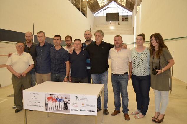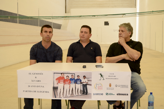 El Trinquet de Sagunt ha acogido hoy la presentación de las actividades preparadas con motivo de la partida benéfica que disputarán Paco Cabanes “Genovés” y Álvaro Navarro el próximo 10 de julio en el trinquet de Massamagrell, veinte años después de la final individual entre los dos pilotaris que tuvo lugar en 1995 en Sagunto y que ganó Genovés.