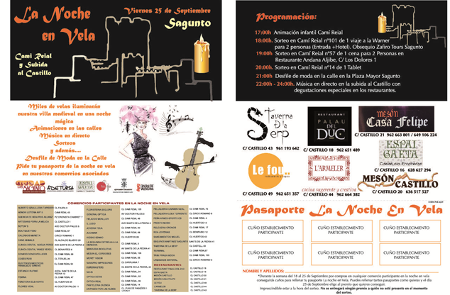 El viernes 25 de septiembre tendrá lugar en el centro histórico de Sagunto “La Noche en Vela”, un evento en el que miles de velas iluminarán la villa medieval creando una noche mágica en beneficio de los comercios del municipio. Estos comercios abrirán sus puertas en un horario especial (hasta las 00.00h) para que los asistentes puedan disfrutar de ofertas y descuentos especiales, además de varios sorteos y música en directo.