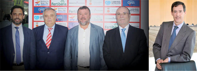 director del Grupo Industrial, Rafael Uguet, del director de la Planta de Sagunto, Juan Arbona, y del alcalde de Sagunto, Quico Fernández, que han puesto en valor la robustez e importancia del proyecto del club para la ciudad, ante la dirección de la compañía, representada por Javier Goñi del Cacho, presidente y consejero delegado de Fertiberia.