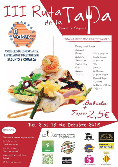 La 3ª edición de la ruta de la tapa se celebrará en el Puerto de Sagunto desde este viernes 2 de octubre y se alargará hasta el 15 de este mes. Esta edición contará con la participación de unos 20 comercios dedicados a la hostelería en el Puerto de Sagunto y se lleva a cabo gracias al esfuerzo y dedicación de ACEISYC (Asociación de Comerciantes, Empresarios e Industriales de Sagunto y Comarca) y con la colaboración de la Concejalía de Turismo del Ayuntamiento de Sagunto.