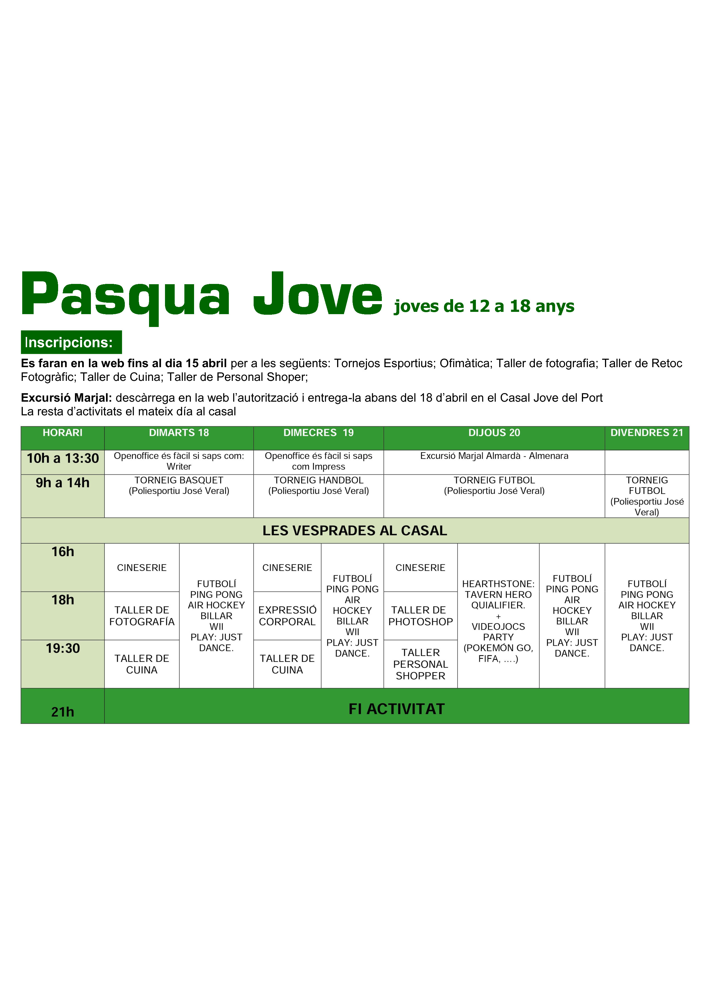 El programa de actividades para jóvenes Pasqua Jove da comienzo hoy. Chicos y chicas de entre 12 y 18 años podrán disfrutar de actividades como talleres de Photoshop, fotografía, cocina, personal shopper, ofimática y torneos deportivos.