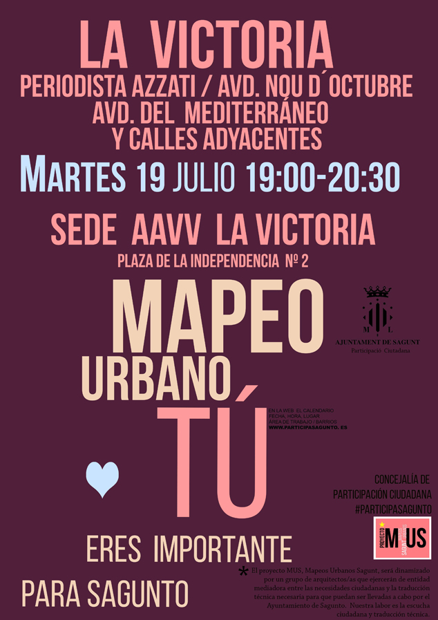 El martes, 19 de julio, la Asociación Vecinal La Victoria recibirá en su sede al proyecto MUS (Mapeos Urbanos Sagunt). El área de Puerto de Sagunto sobre la que se reflexionará de manera conjunta abarca el espacio delimitado por las calles Periodista Azzati, la avenida Nou d´Octubre y la avenida Arquitecte Alfredo Simón hasta llegar a la playa, a la avenida Mediterrani.