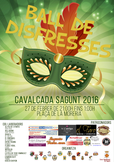 El baile de disfraces está organizado por las trece comisiones falleras de Sagunto, y las de Gilet y Faura, que este año también participarán en la cabalgata. Además cuenta con la colaboración de la delegación de Cultura Popular del Ayuntamiento de Sagunto.