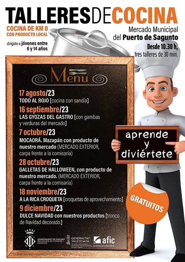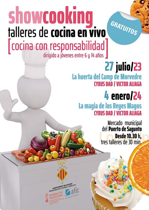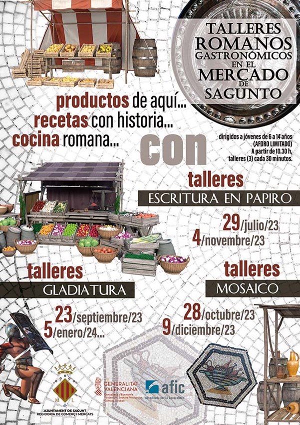 La concejalía de Comercio y Mercados del Ayuntamiento de Sagunto ha programado 16 talleres culturales de diversas temáticas en los mercados municipales de Sagunto y Puerto de Sagunto bajo el lema “Cocina con responsabilidad”. Las temáticas son arqueogastronomía, cocina, infantiles y diversión. Estos talleres se encuadran dentro del programa de dinamización comercial del departamento para impulsar dichos equipamientos comerciales.