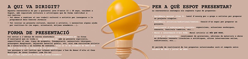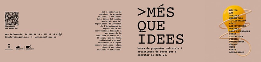 Con el objetivo de apoyar la creación cultural y artística de los y las jóvenes en el municipio, desde el departamento de Juventud e Infancia del Ayuntamiento de Sagunto se abre el programa Més que Idees. Es una convocatoria dirigida a personas de la localidad de entre 12 y 30 años, que de forma individual o grupal realizan o tienen pensado realizar algún tipo de actividad cultural o artística. Pueden ser de música, arte, pintura, escultura, ilustración, cómic, audiovisuales, artes escénicas, diseño, danza, literatura, cine, cortos, documentales, etcétera.