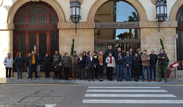 Políticos, funcionarios y ciudadanos han guardado esta mañana un minuto de silencio en las puertas del Ayuntamiento de Sagunto, de la Tenencia de Alcaldía de Puerto de Sagunto y del Centro Cívico en señal de condena y repulsa por el asesinato de una mujer en El Campello, en Alicante.